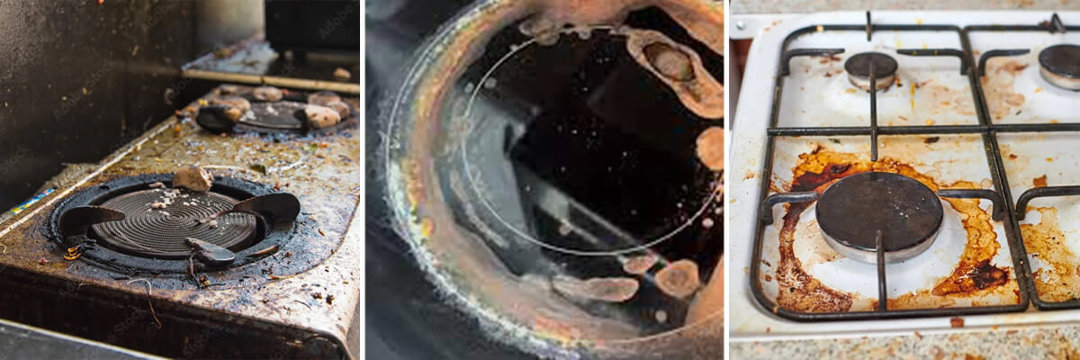 ✅ Küchenoberflächen mit angetrockneten Speiseresten und Fett