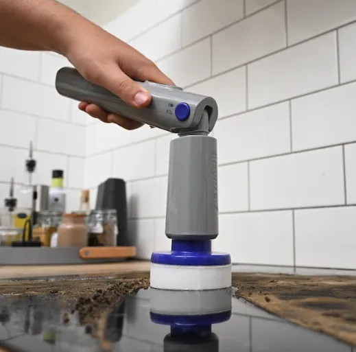 “Without pausing, she clicked off the flat attachment and connected a narrow brush head. Moving to a sample of blackened grout lines that looked decades old, she ran the Synoshi PRO along them. The black disappeared almost instantly, revealing bright white grout underneath.”